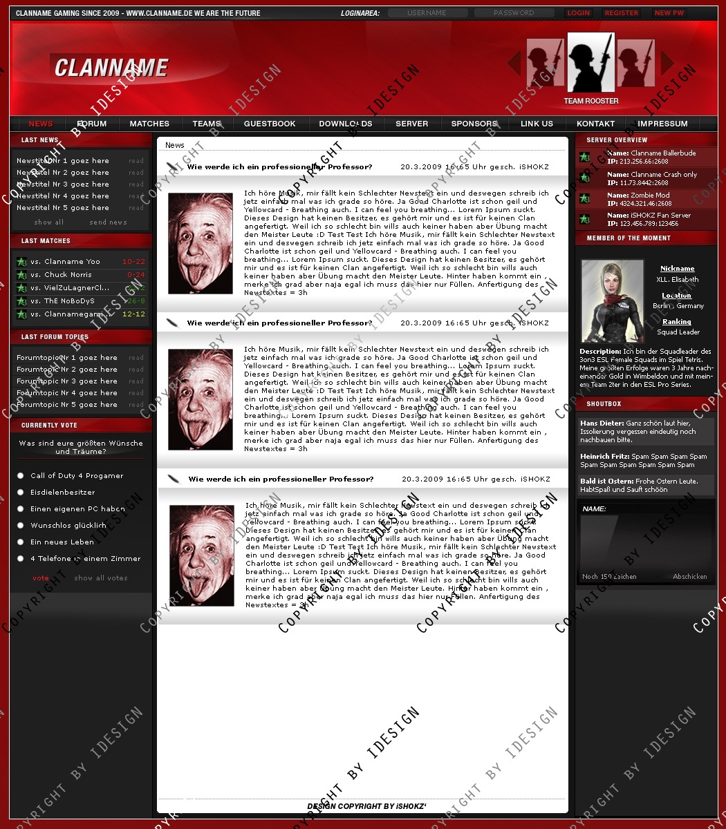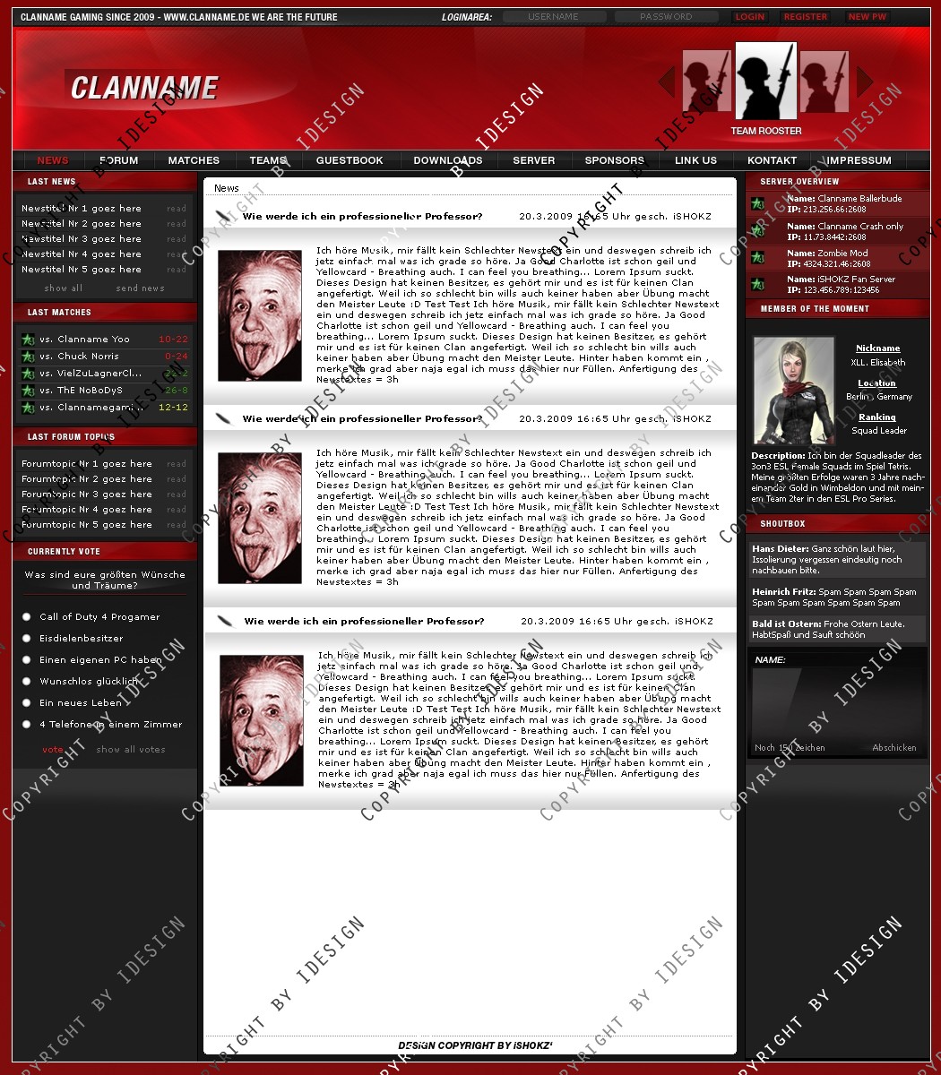 Dies ist ein professionelles Clandesign. Eine übersichtliche und geordnete psd Datei mit allen vorhandenen Ebenen ist vorhanden. Bei weiteren Fragen oder Support wenden sie sich per E-mail an "[email protected]" Dieses Design gibt es auch in Blau, schaut bei meinen Produkten.