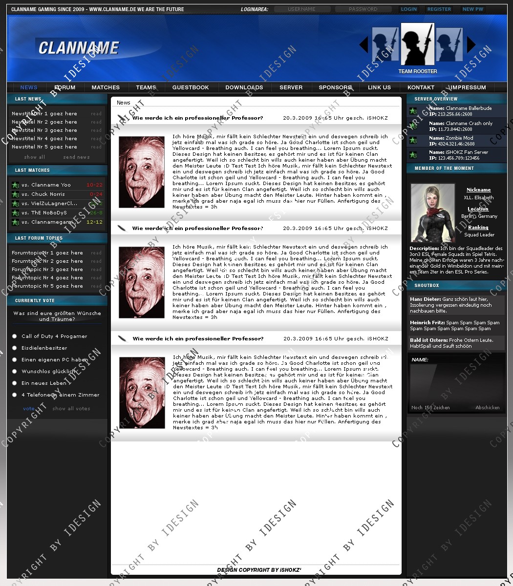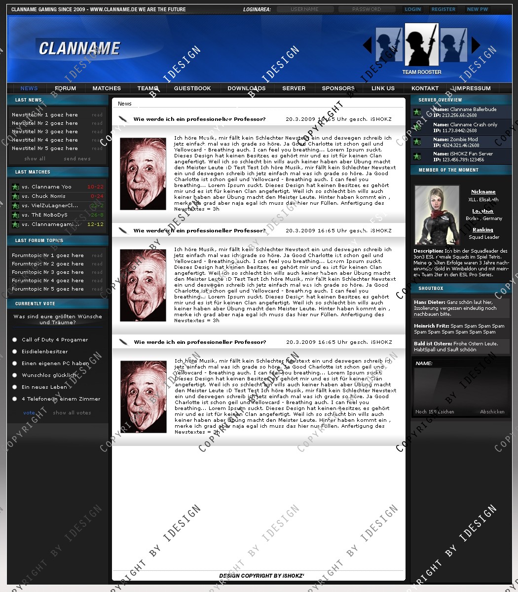 Dies ist ein professionelles Clandesign. Eine übersichtliche und geordnete psd Datei mit allen vorhandenen Ebenen ist vorhanden. Bei weiteren Fragen oder Support wenden sie sich per E-mail an "[email protected]" Dieses Design gibt es auch in blau. Schaut bei meinen Produkten