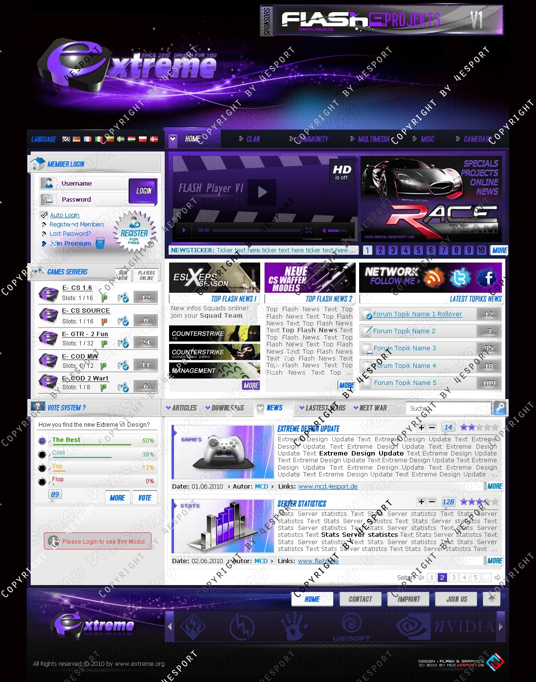b) Rechte Seite: Top Flash News 1, Top Flash news 2, Network, Forum Topics, Tabs System: Artikels, News, Downloads, Latest Wars, Next War.