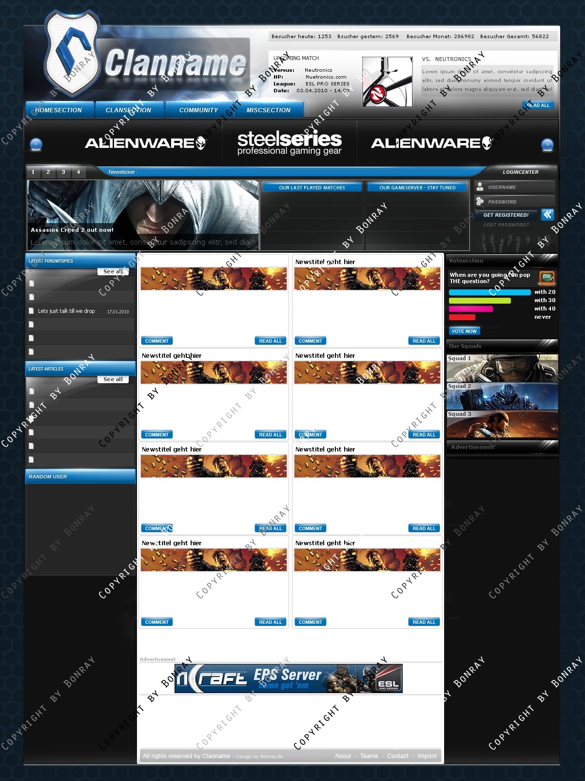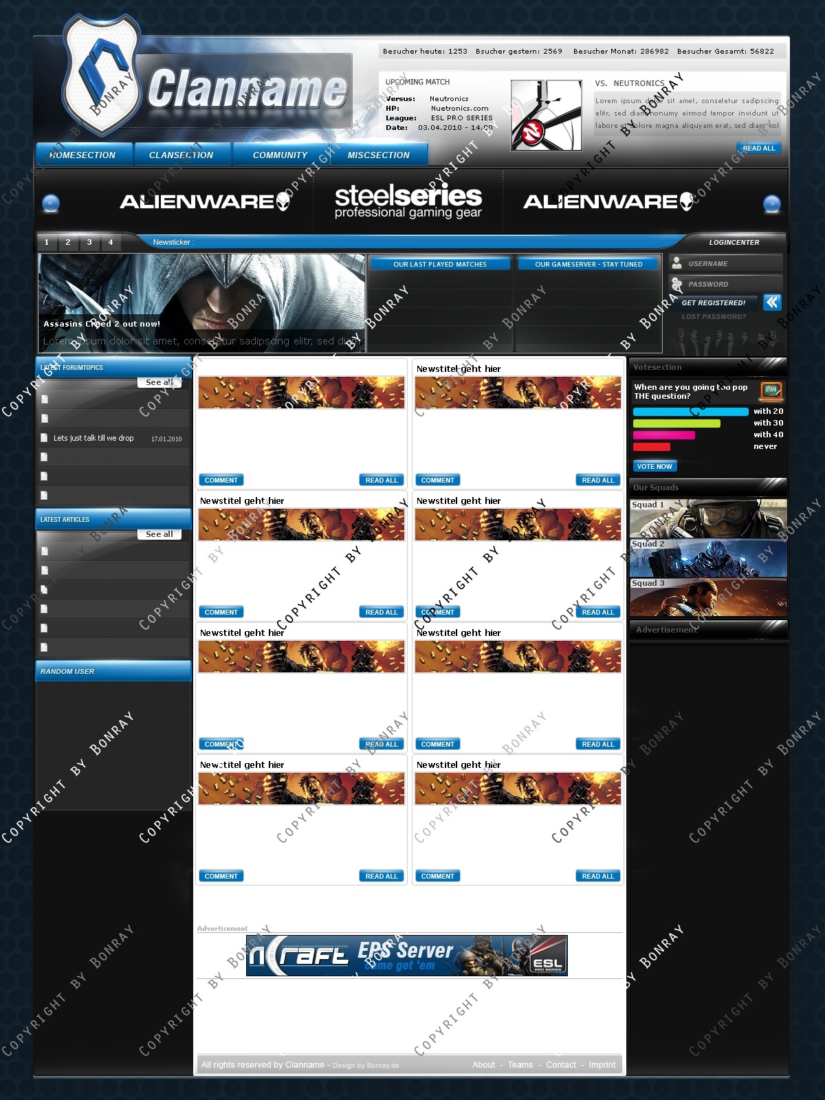 ich biete hier ein frisches, hochwertiges Clandesign in modernen Farben an. Das Design lässt sich einfach slicen und aufgrund des simplen Aufbaus leicht an gängige CMS Systeme wie Webspell und DZCP anpassen. Das Design lässt sich eigenhändig mit allen gängigen Photoshop Version bearbeiten.