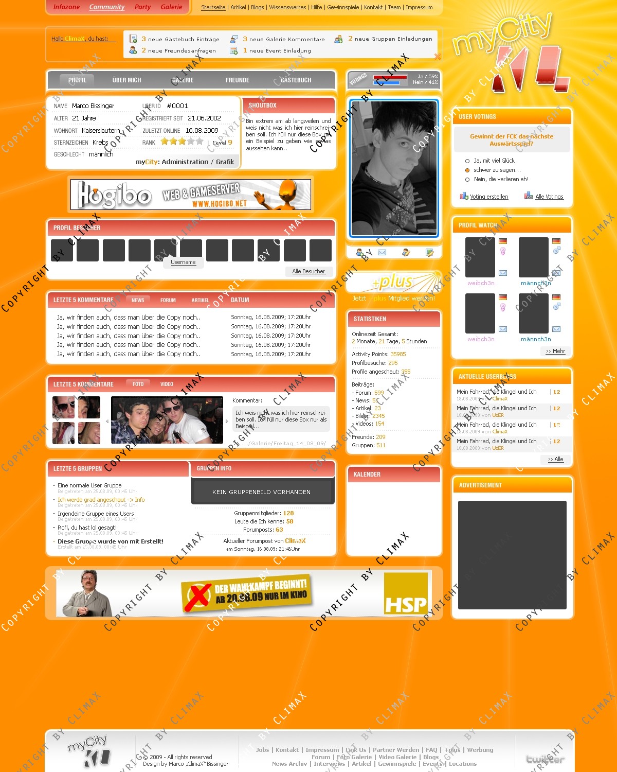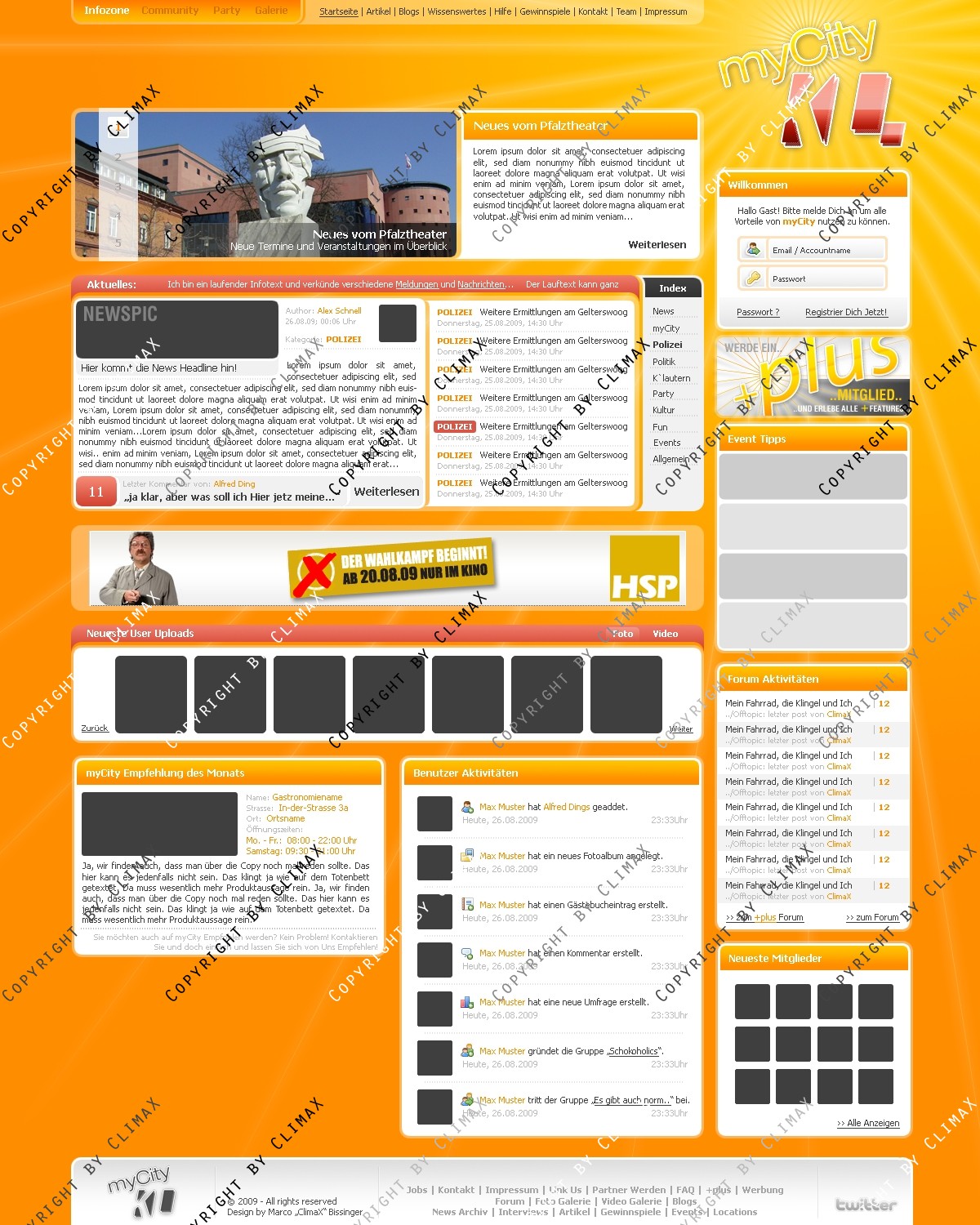 Stelle hier ein Layout für Event / Party Communitys zum Verkauf. Die Startseite sowie die Profilansicht stehen als Unterseiten bereit. Das Design war noch nie Online. Änderungen am Layout können natürlich auf Wunsch gemacht werden. Angeboten wird hier nur die .PSD Datei ohne jegliche Anpassung. Das Logo (myCity KL) dient nur als Platzhalter und ist nicht im Angebot mitenthalten. Bei Fragen stehe ich entweder hier oder in meinem Forum zur Verfügung.
