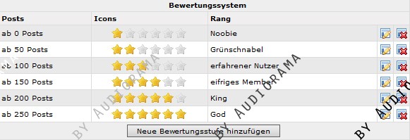 Mit diesem Mod lassen sich Ränge definieren, die ab einer bestimmten Anzahl von Forenposts erreicht werden können. Zu dem Rang selber werden eine für den Rang definierte Anzahl an Icons (hier Sterne) angezeigt, welche für einen Admin bzw. Forenmoderator auch in einer anderen Farbe dargestellt werden kann. Einstellbar ist das ganze bequem über einen neuen Eintrag im Adminmenu.
