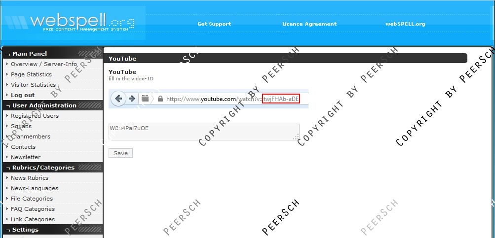 Das Video kann im gewohnten Admincenter von webSPELL geändert bzw. festgelegt werden. Eine kinderleichte Bedienung, auch sehr unerfahrene leute werden mithilfe der beigelegten Installationsanleitung mühelos dieses Addon einbinden können.